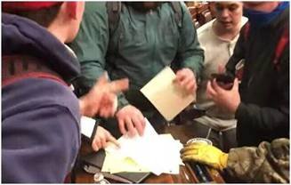 The protestors were unable to confiscate the Electoral Ballots; however, they were able to rifle through a multitude of documents that had been left on the Senate Floor. The following image of rioters searching through documents found in the Senate on January 6, 2021 is from a You Tube Video posted by a reporter that was inside the Senate Floor when the rioters breached the Senate Floor. |