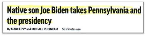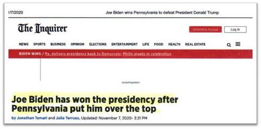 Following the copy of the Email I sent to myself on “Friday, November 6” is an image from “The Inquirer” with the headline that reads “Joe Biden has won the presidency after Pennsylvania put him over the top” to confirm that it wasn’t until the day after I sent the Email to myself that Biden won Pennsylvania. The date on the article posted by “The Inquirer” reads “November 7, 2020” |