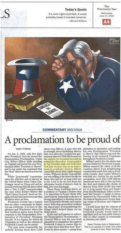 Given these troubling times, as a resident of Frederick County I believe that it is important to honor those like General Milroy who honored the Lord, the union and who honored those held by the Confederate chains of slavery by setting them free. I would hope that the citizens of Virginia especially those living in Frederick County, would want to highlight such an honorable history that no other county or community in America can claim!